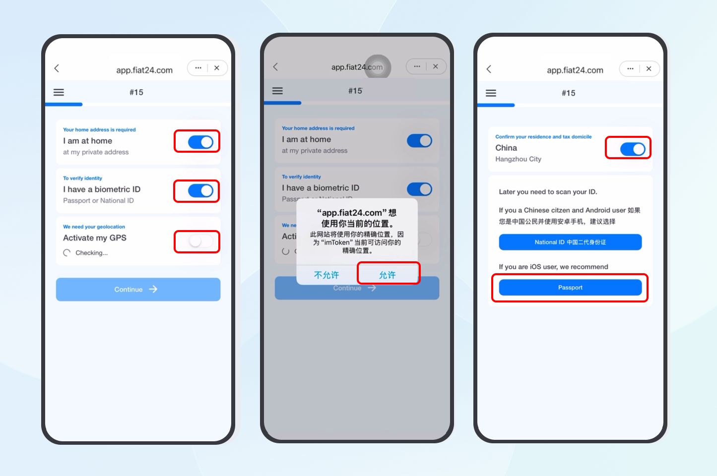 本教程仅适用于「护照」申请。如果你想通过中国大陆居民身份证进行认证,请参考:imToken Card(Fiat24) 中国大陆居民身份证申请教程