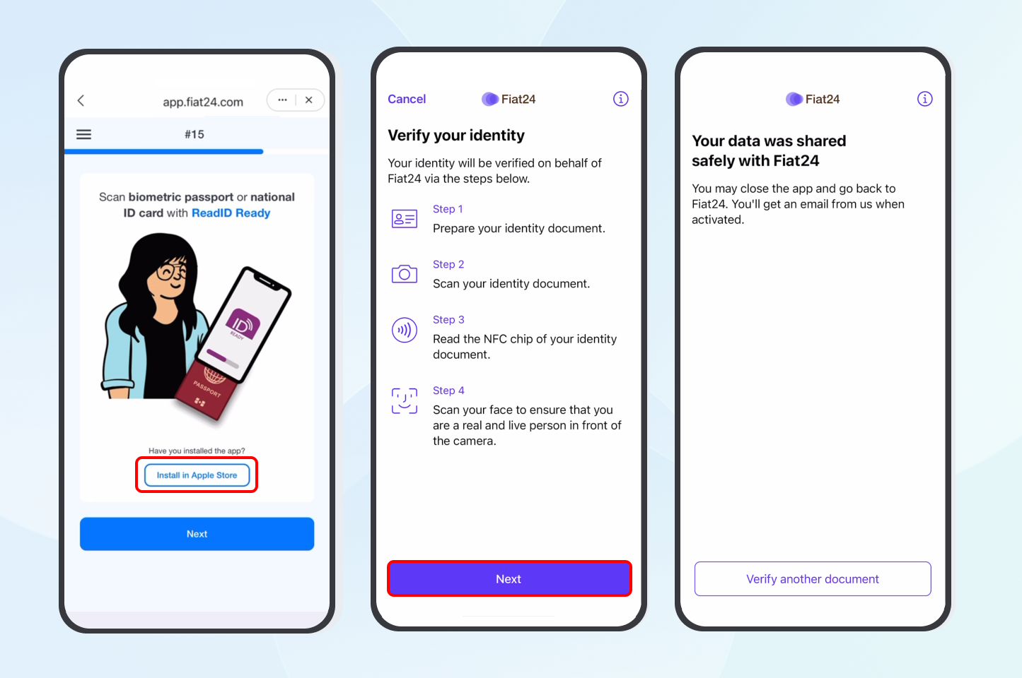 - 下载后返回至 Fiat24 DApp 页面,点击「Next」-「Start」-「Scan my QR code」开始验证身份流程,包括: