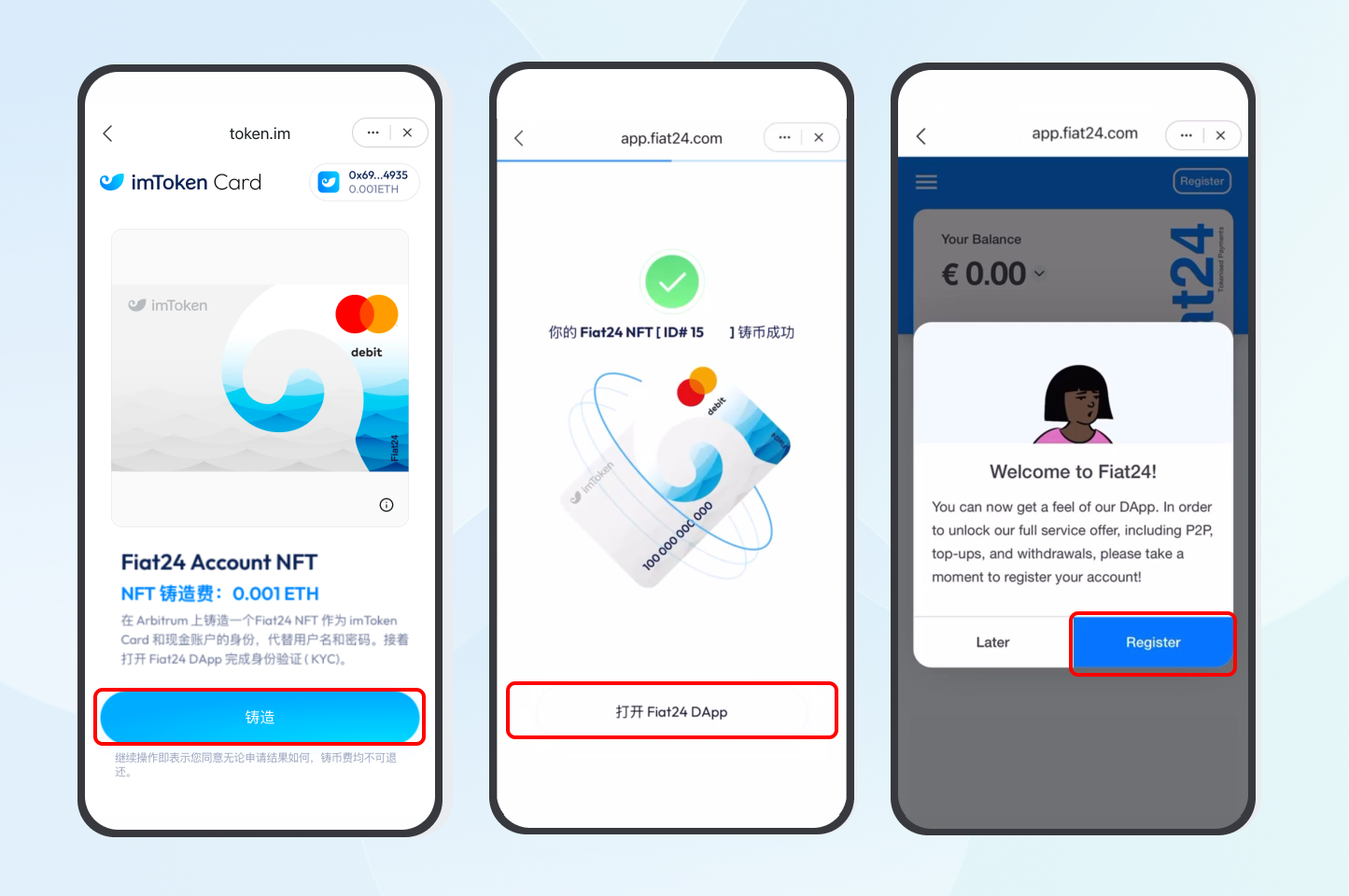- 确保 imToken Arbitrum 账户中有至少 0.0015 ETH。前往 https://token.im/card/mint-nft 铸造账户 NFT。