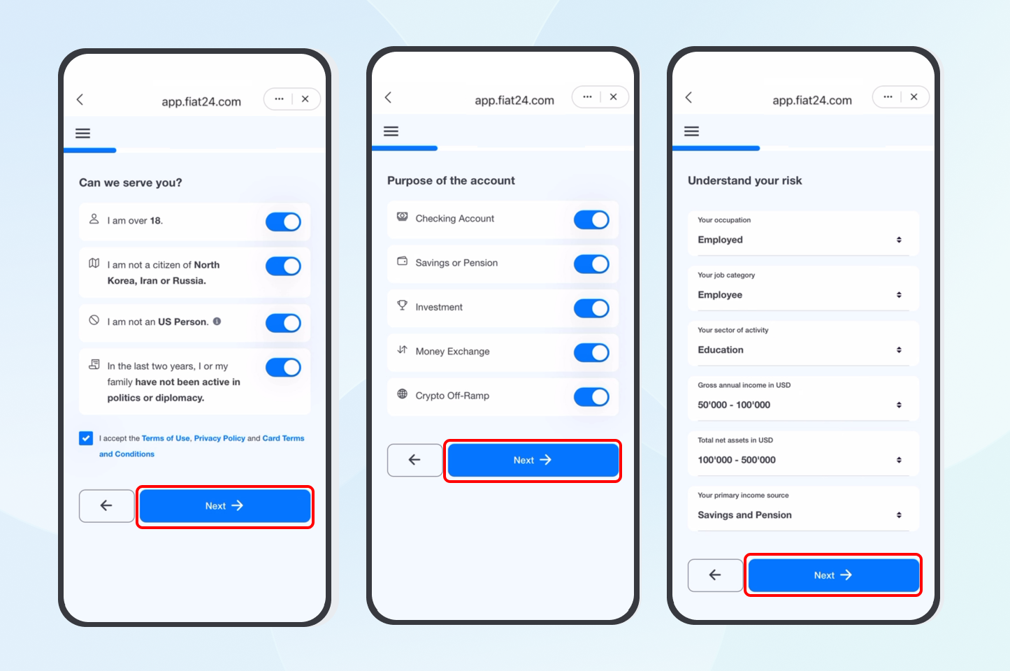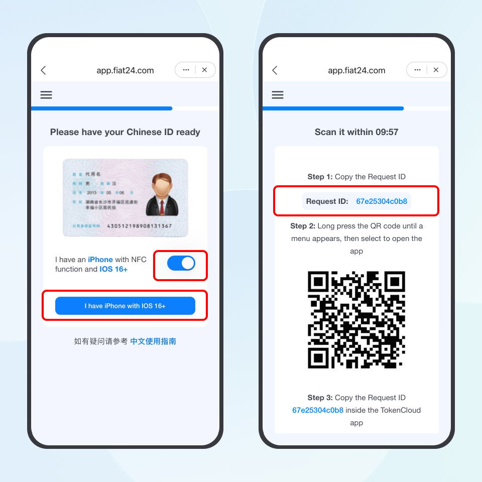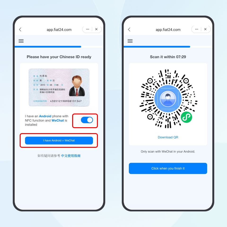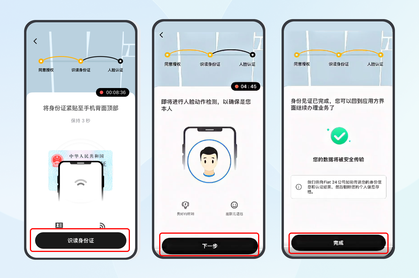 注意:身份证和人脸识别两个步骤需在提示时间内完成。过期未能完成的,请在 Fiat24 DApp 中重新进行身份认证。