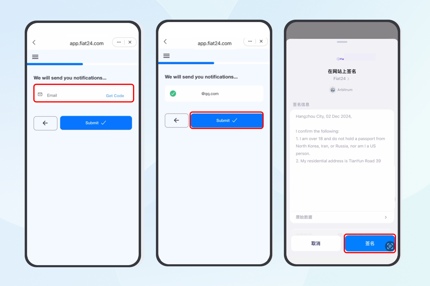 - 根据页面提示点击「签名」确认已填写的个人信息(信息仅用于申请验证,不会上传至区块链网络)。