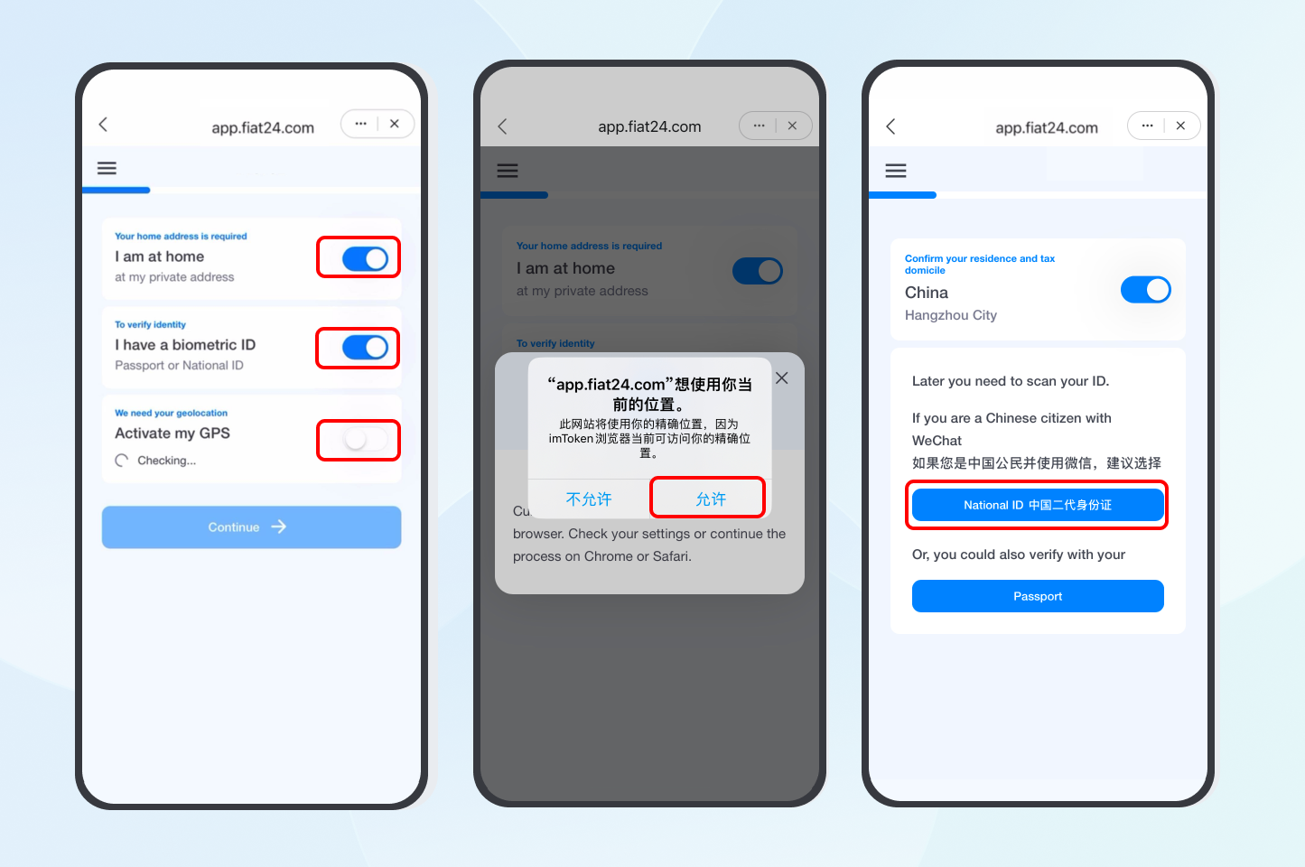 本教程仅适用于中国用户持「身份证」申请。如果你想使用「护照」进行申请,请参考:imToken Card(Fiat24) 申请教程(护照申请)